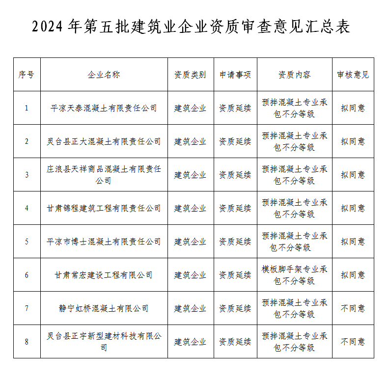 甘肅平涼市:關于對2024年第五批建筑業企業資質審查意見的公示